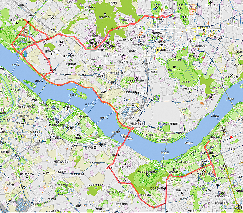 꽤 달린 듯. 이것으로 숭실대 부근과 상암 경기장 부근의 코스를 어렴풋이 알게되다. 하지만, 버스 전용 차로제로 인한 공사의 여파로 도로사정은 엉망. 공사를 하는 것은 좋지만, 임시 차선은 제대로 그려야 안전 운전을 위해 도움이 되지 않을까?
