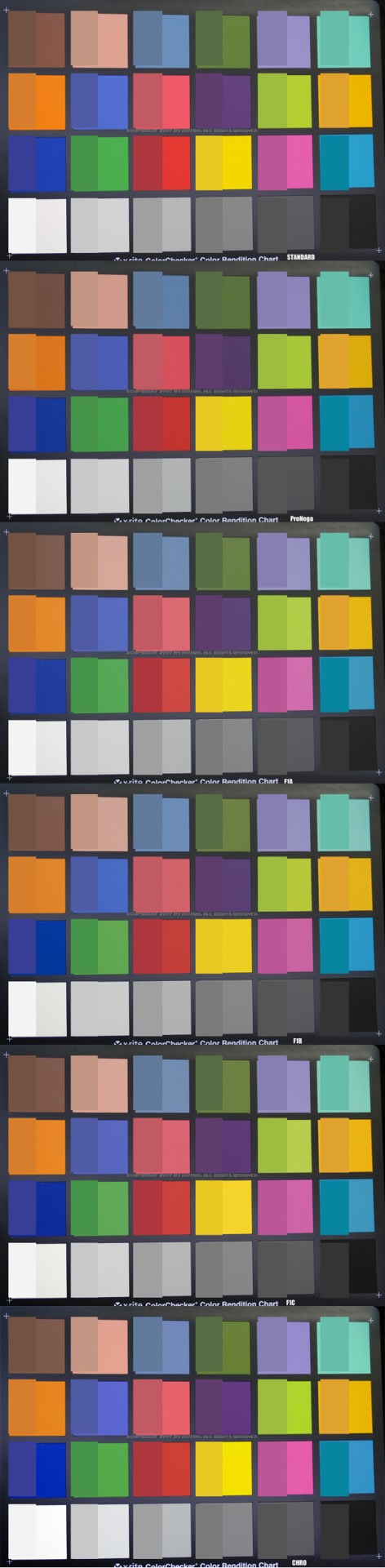 S5Pro의 각 모드별 색상.컬러체커 촬영 후, 원색(sRGB기준값)과 비교해보았다. 왼쪽이 원RGB데이터, 오른쪽이 촬영 데이터.