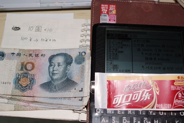 전자사전을 켜고 한중사전에 “교환”을 입력해서 창에 띄우고 메모지에 100圓->10圓x10 이라고 써서 보여줬다. 두 사람을 거쳐 창구로 데려가서 바꾸는 데 성공. 고맙다고 하고는 나와서 바로 편의점에 가서 콜라를 사 마셨다. 콜라는 3위안. 5위안짜리 지폐와 1위안짜리 동전으로 거스름돈을 받았다. 그리곤 기쁜 마음에 콜라를 한입 마셨는데….