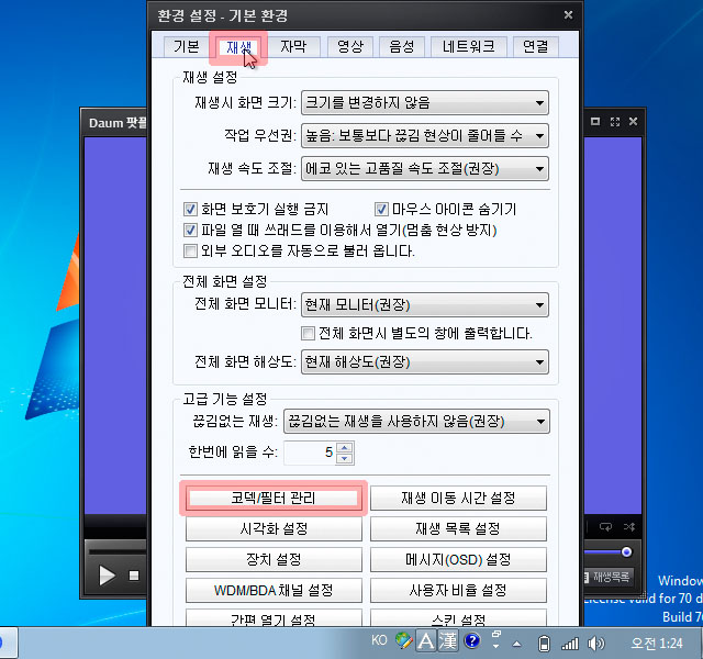 재생 탭을 선택하고 밑의 코덱/필터 관리 버튼을 눌러 줍니다.