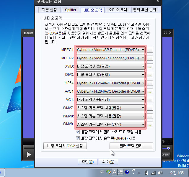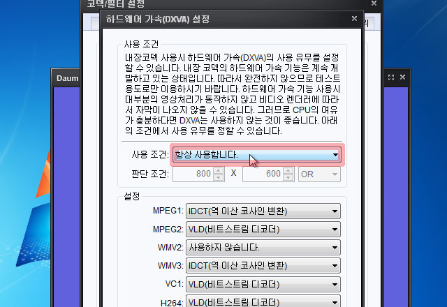 내장 코덱의 DXVA설정 버튼을 눌러 주고 다음과 같이 세팅을 바꿔 주고 확인을 누릅니다.