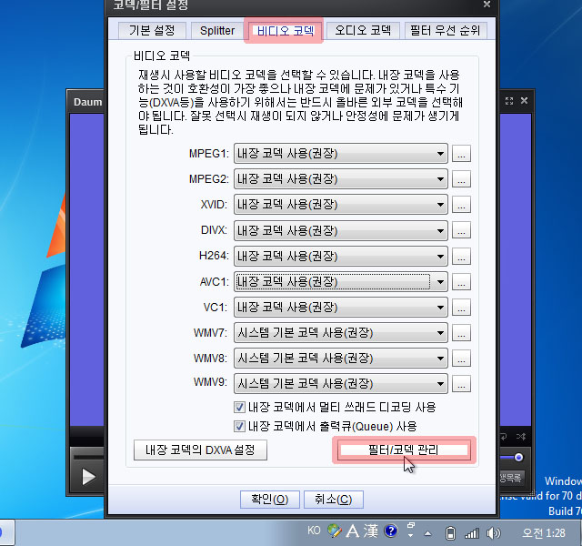 비디오 코덱 탭을 선택하고 밑의 필터/코덱 관리 버튼을 눌러 줍니다.