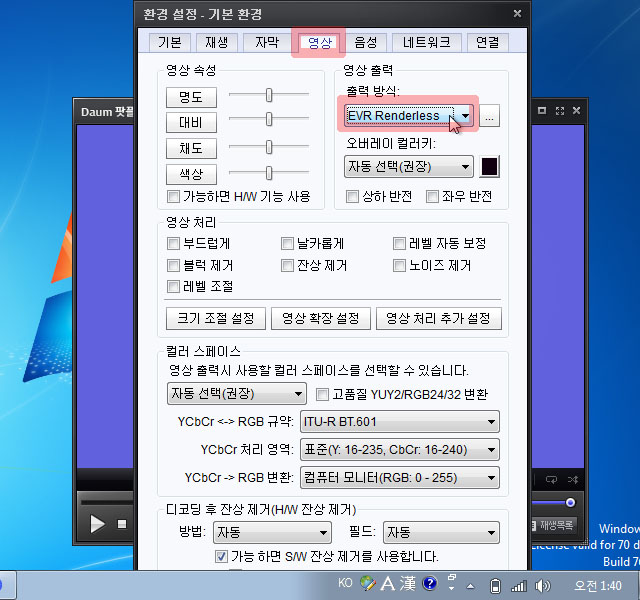 다시 환경설정의 영상 탭을 누릅니다. 영상 출력 부분을 다음과 같이 EVR Renderless로 바꿔줍니다.