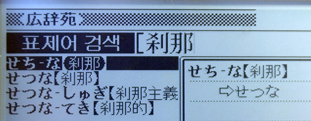 일본어 사전에서 찾아보자. 이 한자를 보고 바로 발음이 떠오른다면 얼마나 좋겠는가? 하지만, 그렇지 못하니 사전을 찾는 게 아니겠는가. 일단 刹을 보고 일본어 사전의 뒤에 첨부된 일본어 한자 읽기표에서 발음을 찾는다. 총획수는 8획이고 刂 (칼 도)변인 것을 알아내어 刹을 찾는다. 이제 刹의 예제에서 刹那를 찾고 그 발음이 「せつな」라는 것을 확인한다. 다시 앞으로 넘겨 せつな로 사전을 찾는다. 이제, 刹那는 찰나, 순간이란 뜻임을 알게 된다.