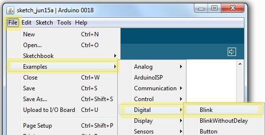 제일 먼저 할 일은 File -> Examples -> Digital -> Blink 를 순서대로 누르는 것입니다.