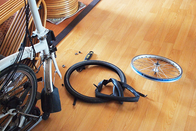 밖인가 했는데 집안, 자전거 타이어에서 나는 소리였다. 2년간 썼던 튜브인데 바람 넣을 때마다 옆으로 힘들어간 게 원인이었던 모양이다. 주입구 부분이 림에 눌려 균열이 나서 갈라졌다.