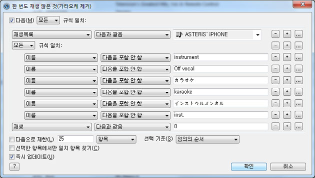 이 값들은 iTUNES의 스마트 리스트 기능을 이용해 그때 그때 새롭게 정리된 곡리스트로 만들 수 있다.