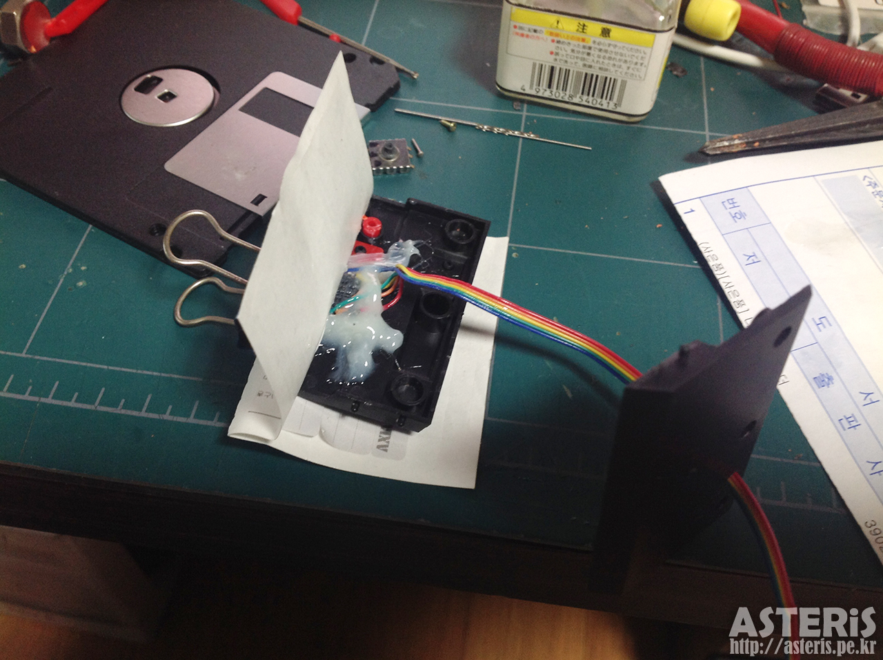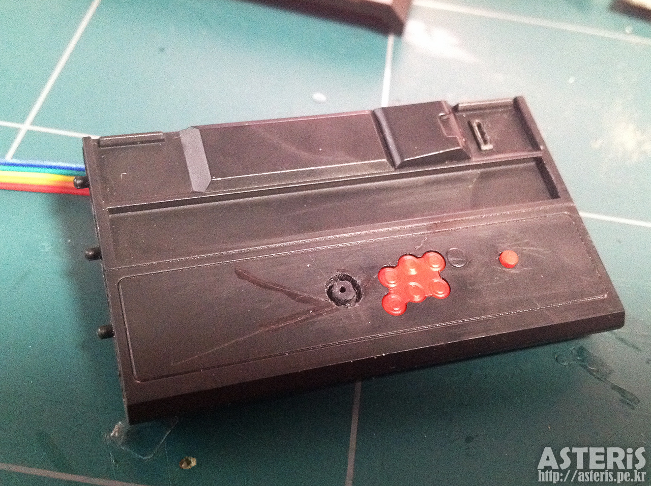 전원은 누르는 것으로, 메뉴호출은 당기기, +, -는 좌우로 움직여 넣게 할 생각입니다. 배선을 해주고, #1에서 올렸던 것처럼 뷰릭스 컨트롤패널쪽 스틱부분을 과감하게 드릴로 뚫어줍니다. 크기는 위 스위치의 직경 정도. 그리고 스위치를 달고, 에폭시 접착제로 굳혀줍니다.