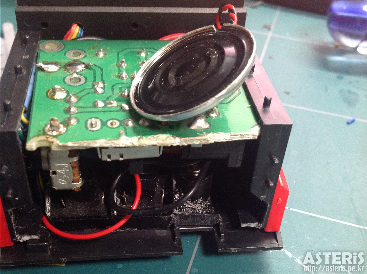 이렇게 작은 모델 안에 넣으려면 아주 밀집된 소형 키트로 된 것을 쓰거나 새로 만드는 게 좋겠지만, 있는 것을 쓰는 게 돈을 아끼는 것이므로 회로가 끊기지 않는 선에서 적당히 넘어가는 부분은 니퍼로 잘라내고 줄로 다듬어 빈 공간에 넣어줍니다. (사실 앰프 키트로 사도 몇천원이면 삽니다. 뭐그래도 있는 걸 없애야…)