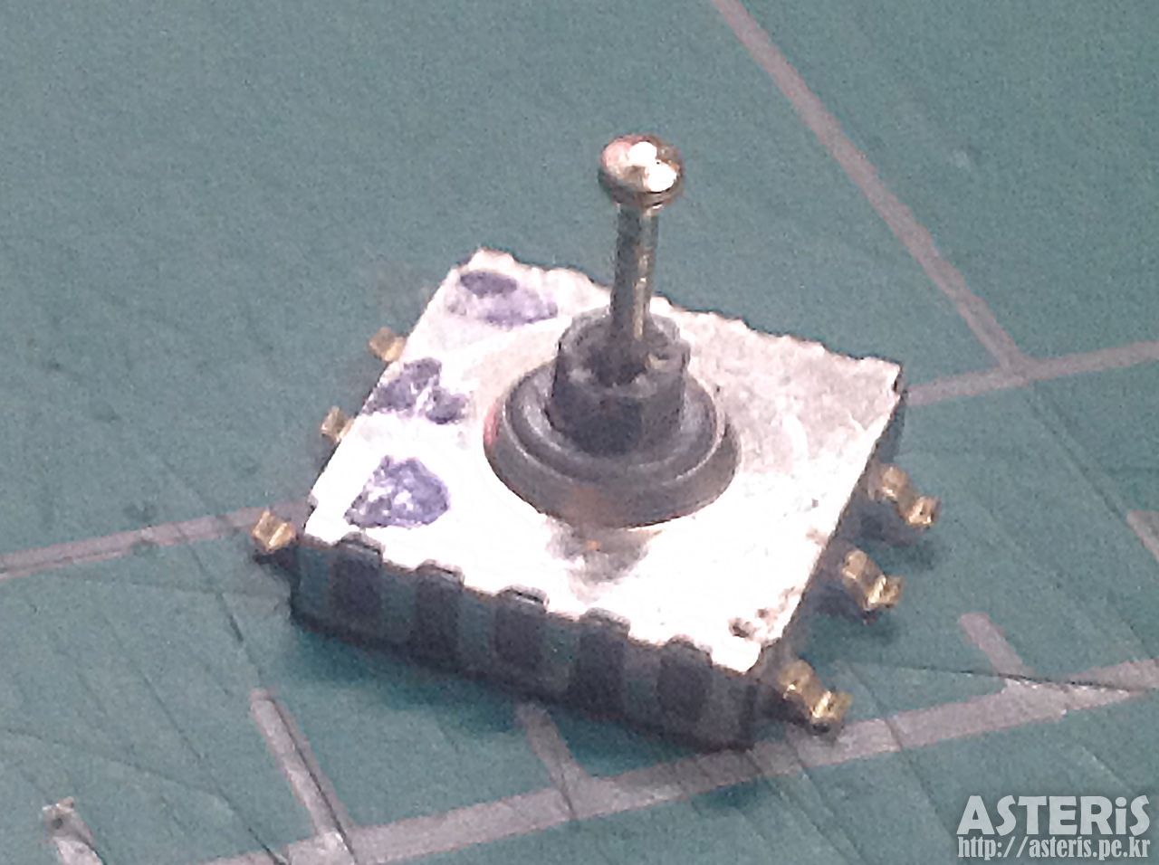 화면 나오는 것은 확인 되었으니, 기능 버튼들을 넣기로 맘 먹었습니다. AD보드에서 사용하는 버튼은, 전원, 메뉴, +, – 이렇게 4개입니다. 뷰릭스 캐비넷은 게임기 통이고, 게임기 통이라면 역시 스틱이나 버튼으로 구현하는 게 맞다고 생각했고 적합한 스위치를 부품함에서 찾아봅니다. 예전에 사놓은(뭔가 사재기를 좋아해서 이런 저런 것들이 있습니다.) 스위치 중 적당한 게 있었습니다. 내비게이션 스위치로 상하좌우와 누름기능이 있습니다.