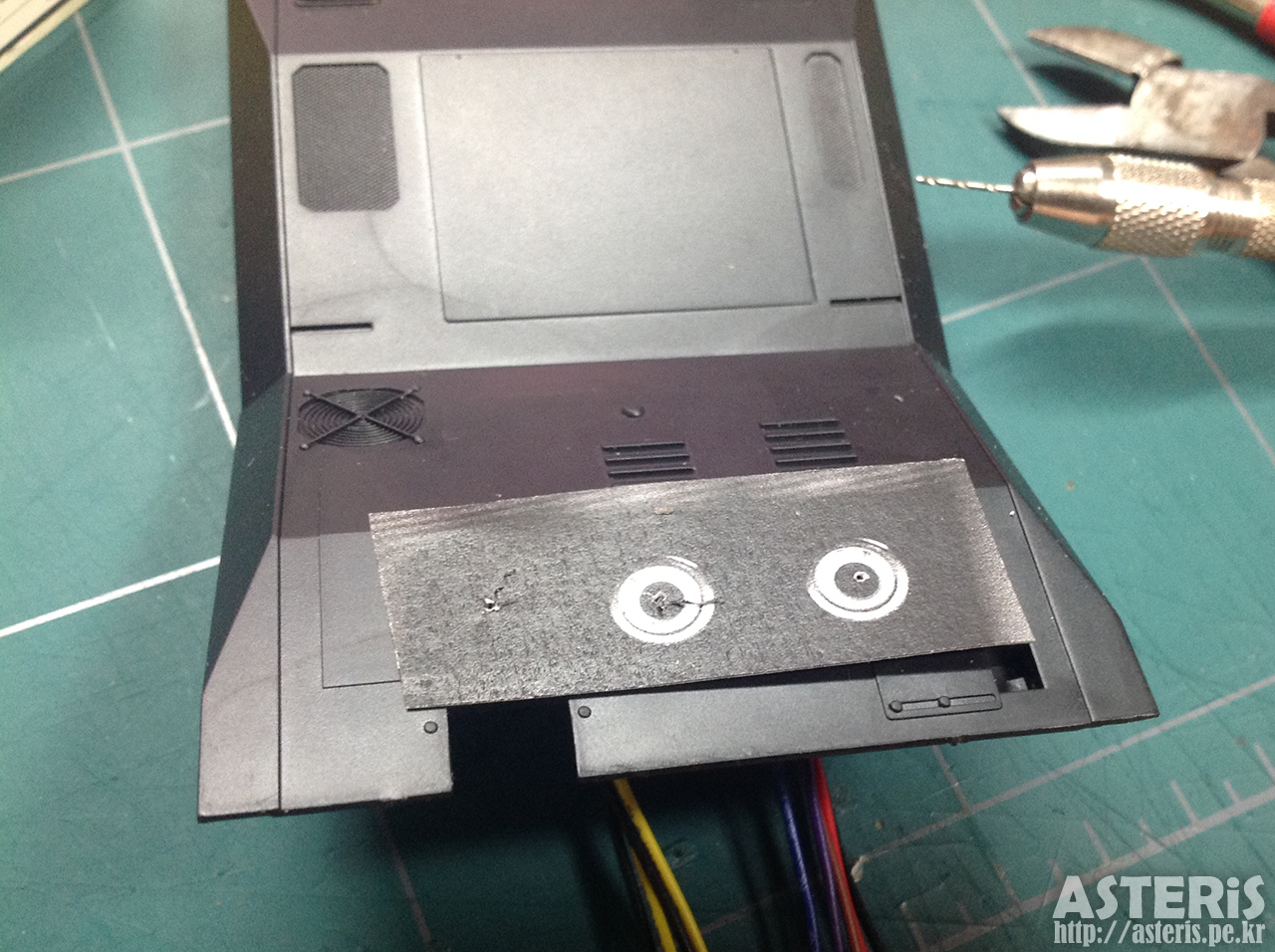 뒷쪽 패널에 적당한 위치를 잡고 핀바이스로 각 단자별로 센터를 잡아주고,