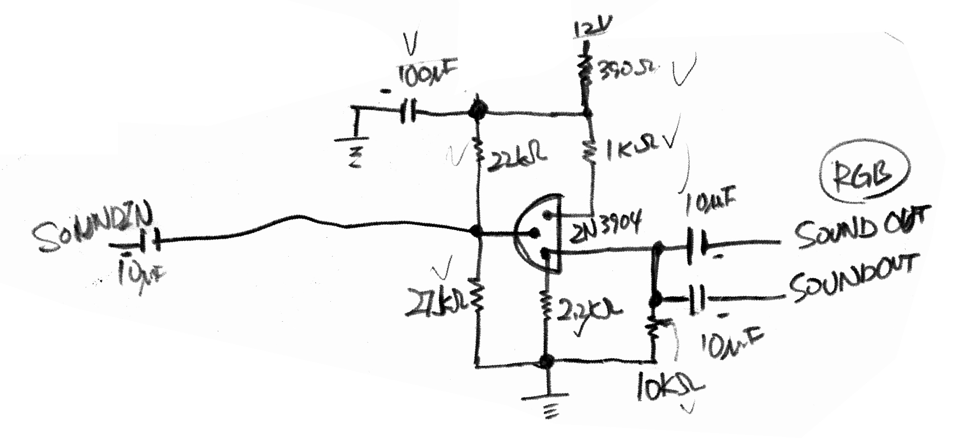 하나의 SOUND IN에서 같은 SOUND OUT 을 하나는 컴포지트 비디오 신호와 함께 RCA 잭으로 제공하고, 하나는 다시 메인보드로 돌려보내 RGB포트에서 쓰도록 되어있다.