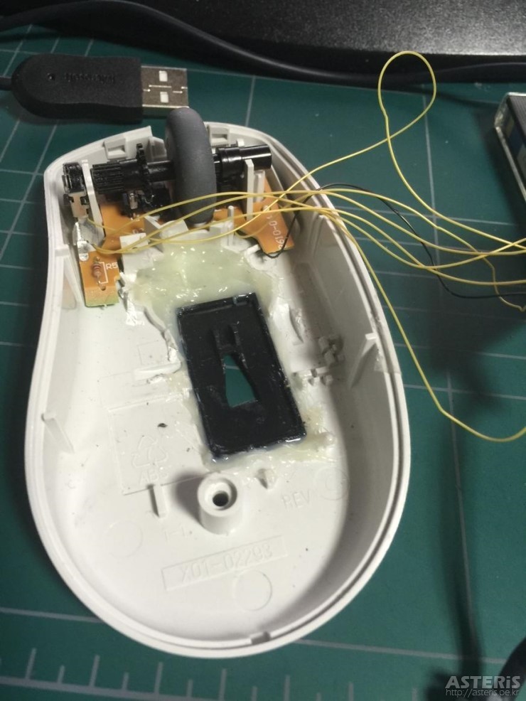 동작하는 것을 확인했으므로, 케이스 가공에 들어간다. 광마우스의 바닥 센서창 부분을 잘라내서 인텔리 마우스에 이식해준다. 에폭시접착제로 틈을 막아주고, 고정시킨다.