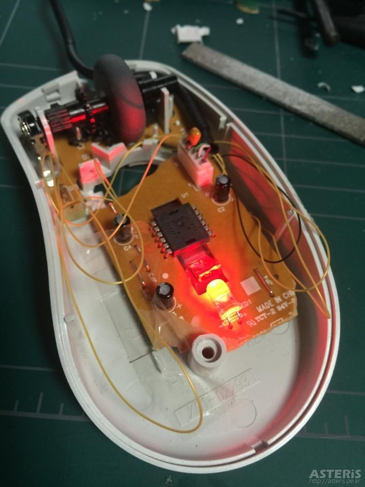 그래서 인텔리 마우스의 버튼과 휠버튼을 그대로 쓰고, 광마우스의 휠회전센서를 뽑아서 옆으로 끼워 이식하는 방법을 쓰기로 했다.