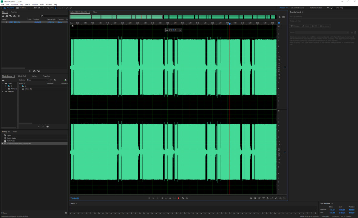 녹음이 다 끝났으면…. 적당히 앞뒤 필요없는 부분을 잘라주거나, 적절한 포맷으로 변경해(44.1KHz/16bit) 주는 작업을 합니다.