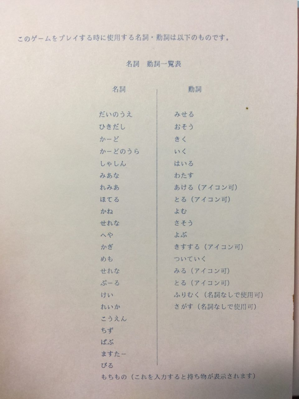 매뉴얼에 나와 있는 명령어 표 없이 플레이한다면 어떤 말을 해야 하나 싶어 상당히 고생했겠지만, 그나마 저 정도의 명령어를 쓸 수 있다는 표가 있으니 생각보다 고생은 덜하게 된다・・・는 개뿔, 대체 뭔 명령을 입력해야할지 고민스럽기만 하다. 거기에 키보드 입력 반응도 느려 한 자 한 자 입력되는 것을 확인하면서 천천히 입력하고, 딱 맞는 명령을 입력해야 하는 데다 같은 명령을 몇 번씩 입력해 진행해야 하는 경우도 있다.