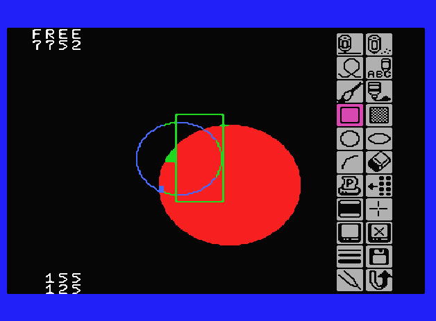 빨간색으로 칠한 원에 파란 원, 녹색 사각형을 그렸을 뿐인데, 3색이 겹치면 나중에 칠해진 색이 먼저 칠해진 색을 덮어버리는 현상이 나타난다. MSX에서 컬러 그래픽을 그리려면 저런 현상을 염두에 두고 그려야 하므로 참 귀찮은 일이다. 위의 ZARTH의 화면도 살펴보면 머리카락 색이 옆으로 번져 있는 것을 확인할 수 있다.