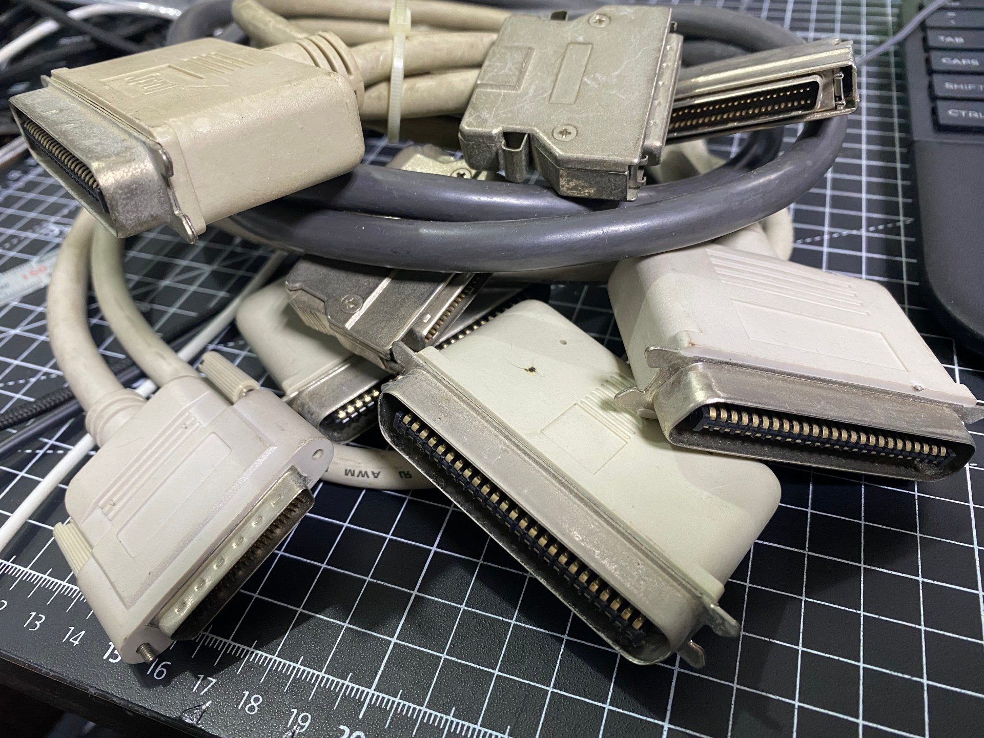 SCSI케이블은 예전부터 써왔던 것을 바로 이용할 수 있을 줄 알았는데, SCSI하드디스크 에뮬레이터에서 쓰는 것이 HPCN50 규격이라 바로 쓸 수 없어 추가로 구입했다. 가지고 있는 것은 CN50과 HPDB50으로 구성된 이런저런 케이블들.