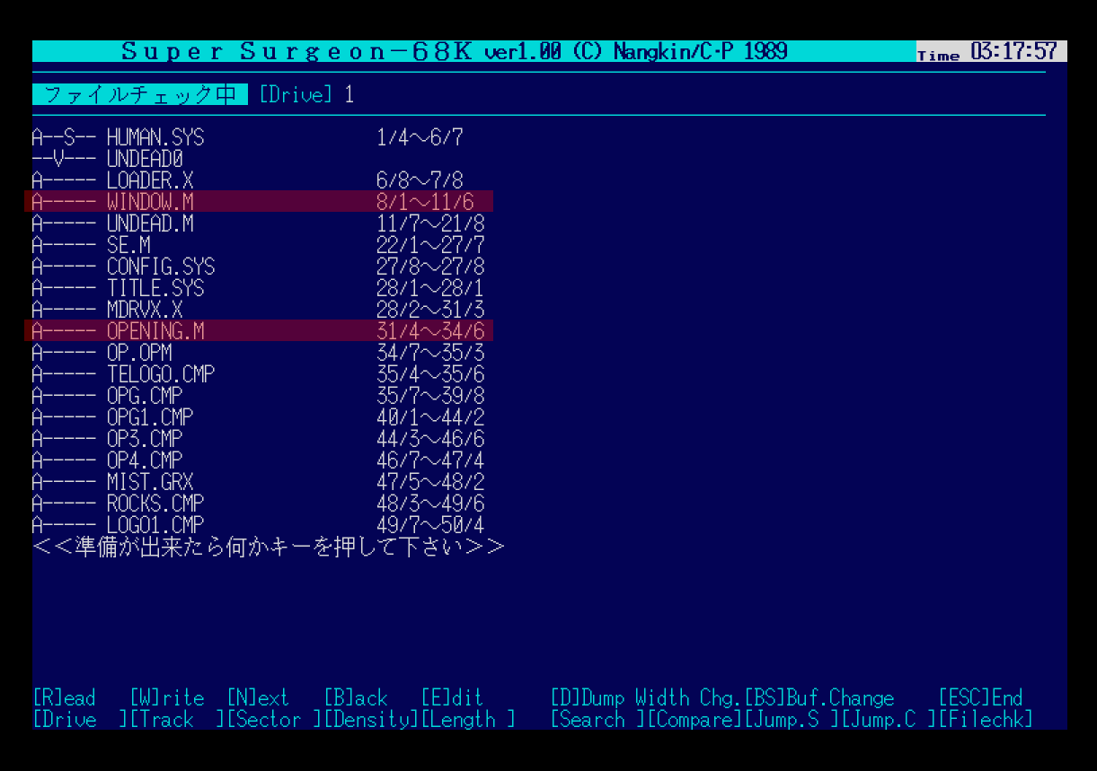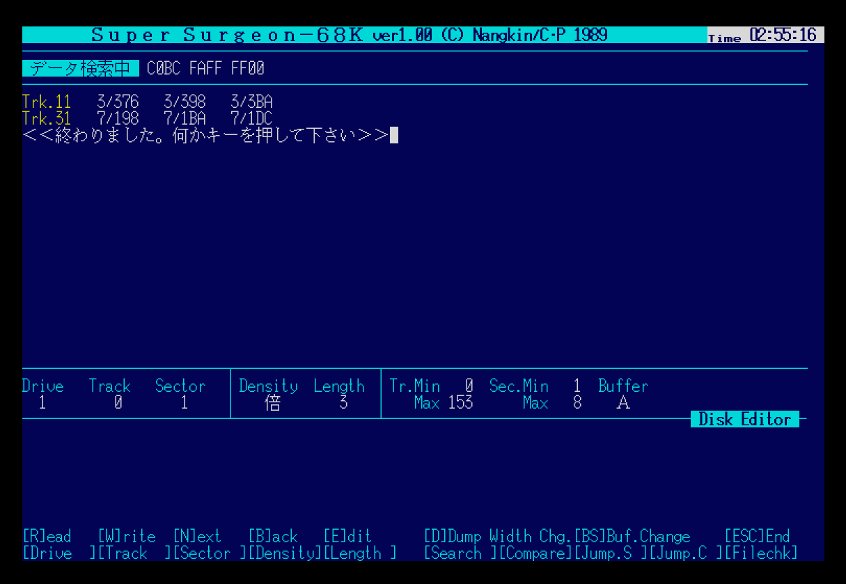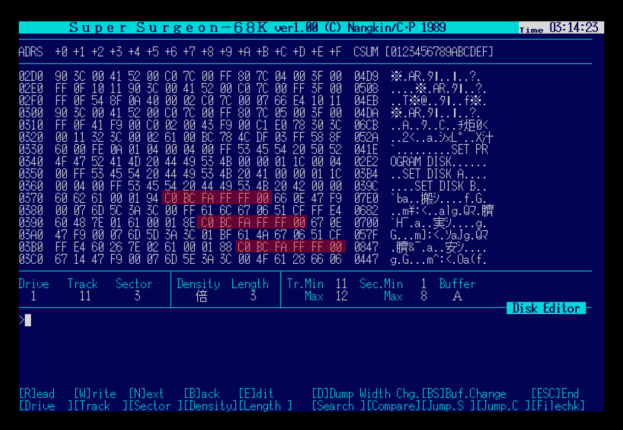 PEC나 백업활용 테크닉 12권부터 소개하는 The Surgeon-68K의 코드를 입력하거나, Super Surgeon-68K등을 구해서 실행할 수 있다. 여기서는 Super Surgeon-68K를 이용한다. Tool Box의 ディスク・エディター(디스크 에디터)를 선택한 뒤 [F1]키로 서치할 디스크 드라이브를 지정하고, [F6]키를 누른 뒤 위의 데이터를 입력하면 결과를 얻을 수 있다.