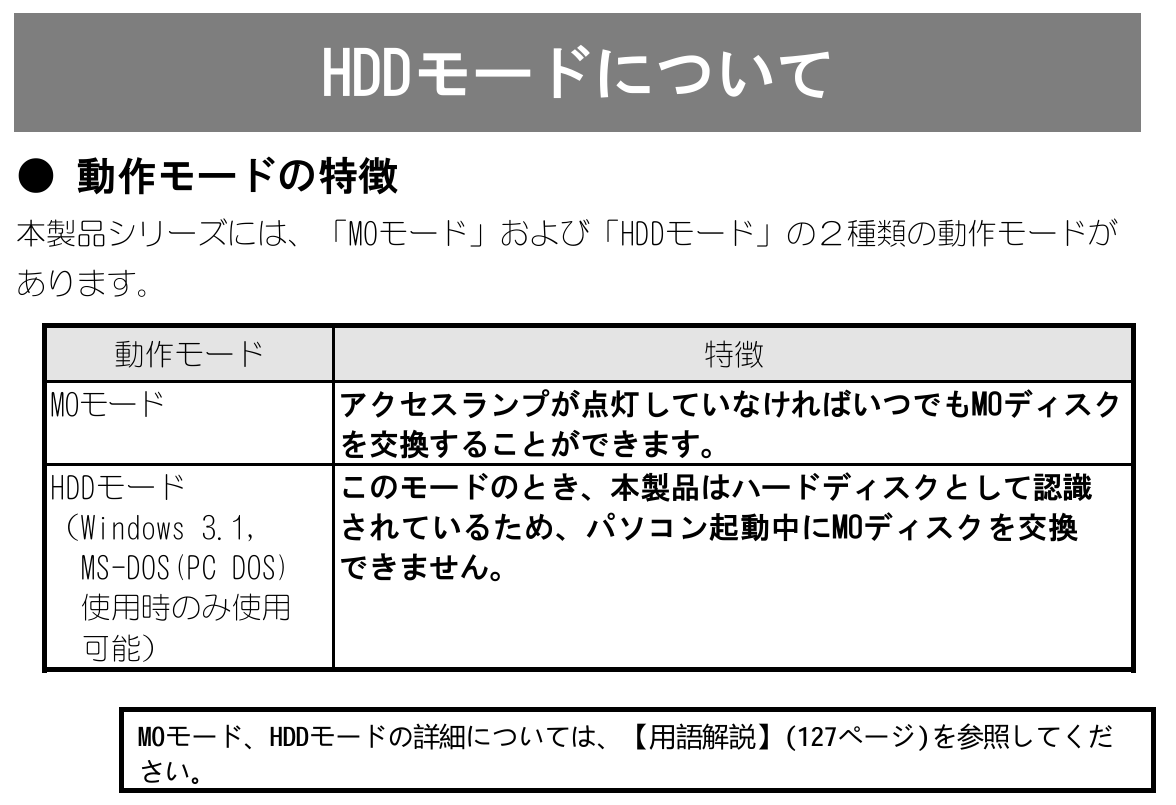 HDD모드에 관한 설명도 있는데, 별다른 내용은 없고 HDD모드로 설정하면 하드디스크로 인식되므로, 컴 기동 중에는 MO Disk를 바꿔 사용할 수 없다는 내용이었다.