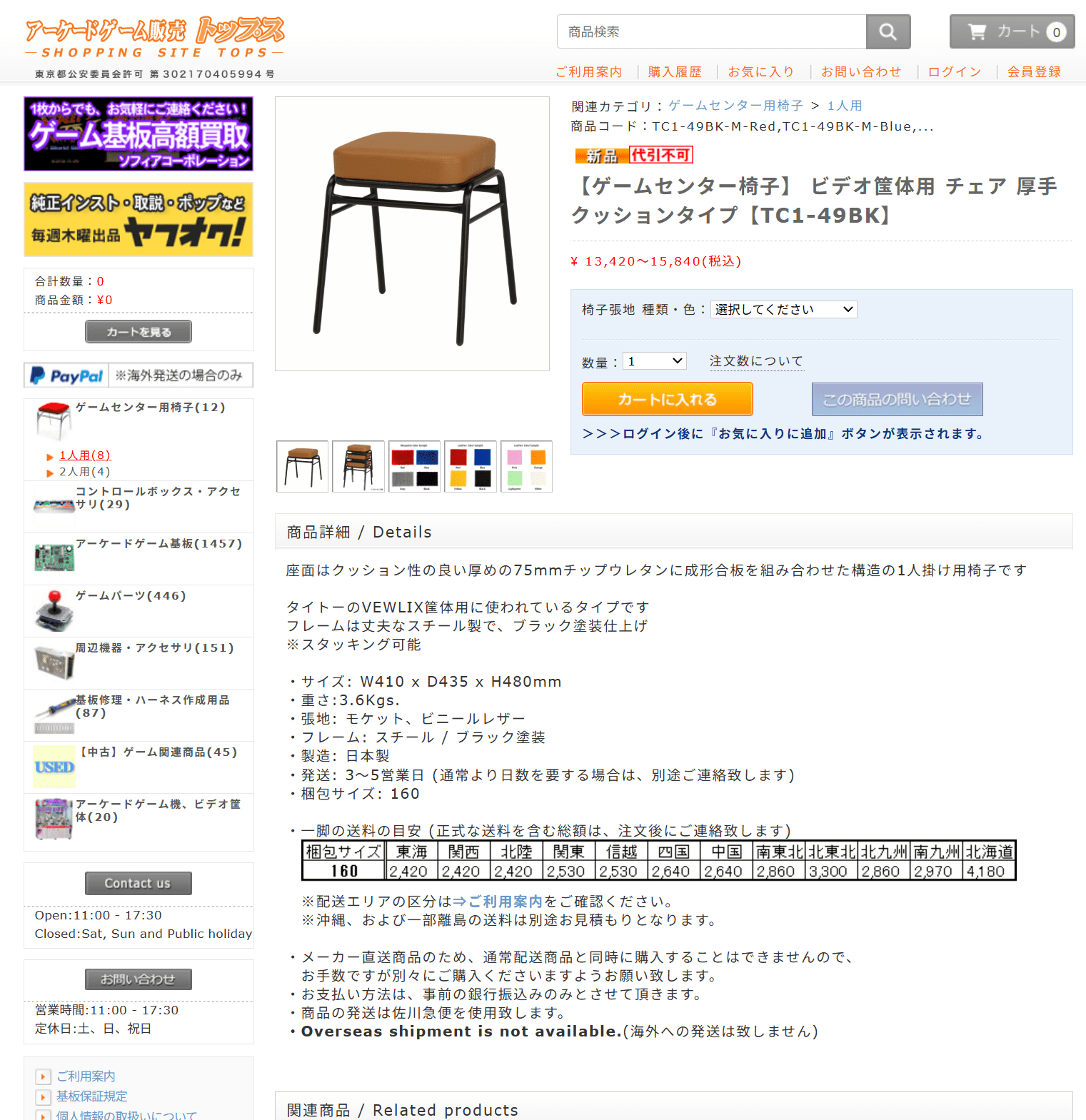 【ゲームセンター椅子】 ビデオ筺体用 チェア 厚手クッションタイプ【TC1-49BK】 / / アーケードゲーム販売トップス